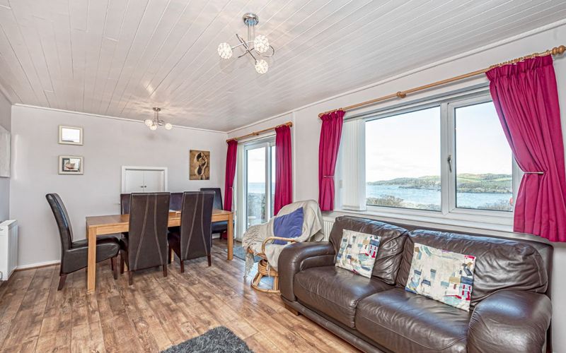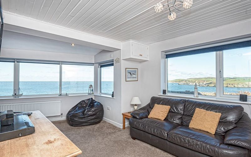 Open plan space from the kitchen leads to an open plan relaxed sitting area, with a three seater leather sofa, and rattan easy chair, with yet another window with a spectacular view. There is an electric flame effect fire, which is very cosy even with just the flames on for effect. Next to this, and also in the open plan area is the dining table with seating for six. The dining table looks out through patio doors to the sea, and Cemaes Bay beach, so a great view while you eat. The patio doors are very handy for reaching the garden and barbeque spot, or to just open and enjoy the sea air while you eat.