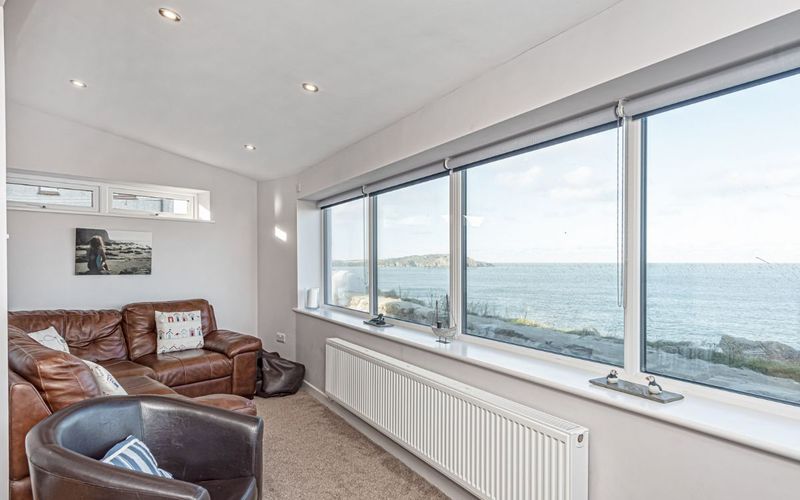 Through the old serving hatch by the table, you get views towards Wylfa head, and a glimpse of the new sea room, which replaced the old conservatory in early 2019. This is now an L- shaped lounge-dining area with a TV/ games area, including a flat screen 48 inch TV with Freeview, surround sound and DVD player. The surround sound also plays iPods, so do bring your music. There is also a coffee table, and a selection of games including Monopoly, Blokus, Chess and playing cards, for any rainy days – after you have come back from all the rainy-day activities outside of course. Round the corner from this there is a leather corner sofa with amazing views, standing in the new sea room you have over 180 degrees of sea view, watch the video to see what we mean! This room catches the evening sun. A lovely place for a sundowner. From here you can watch for dolphins feeding off the point, the sun dropping into the sea, or the ships cruising across the horizon.