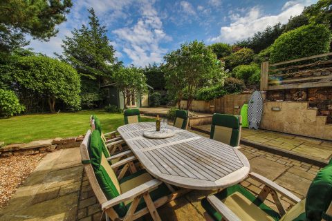 The garden has a patio area as well as a separate seating area. The raised terrace has steps up so children should be supervised.