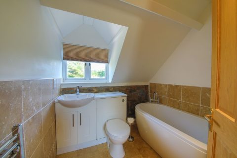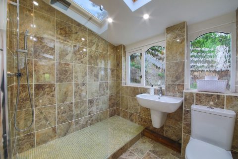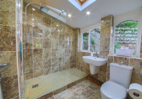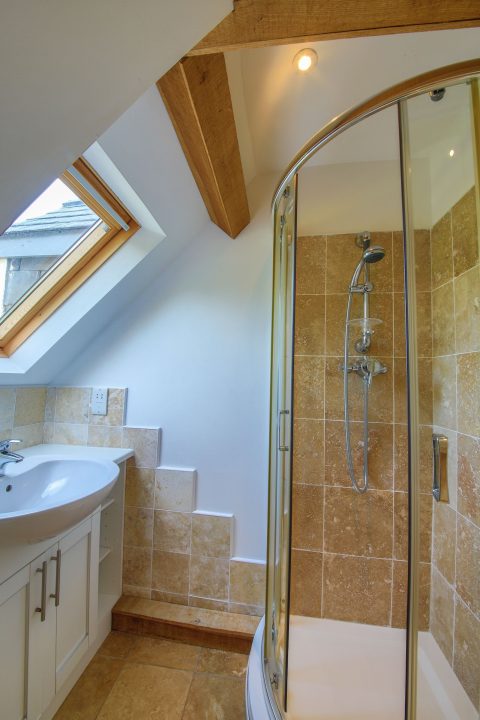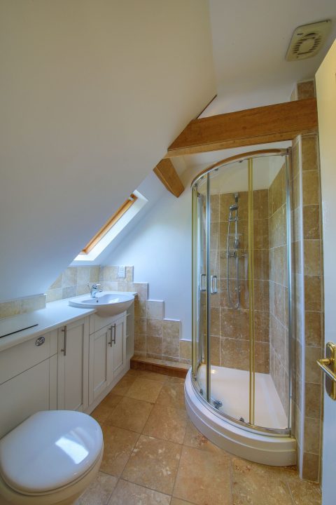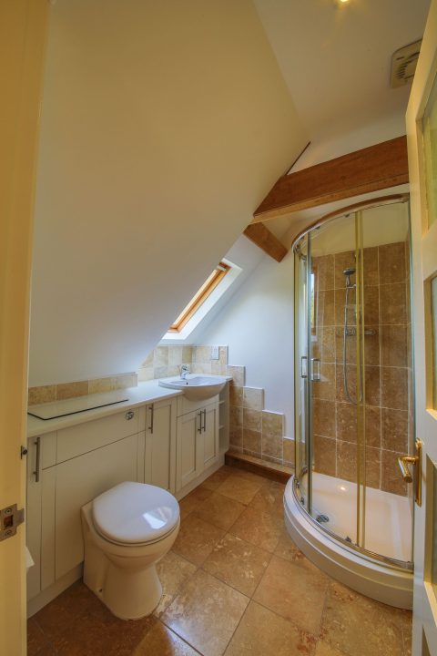 There is a tastefully tiled shower room with toilet and sink offering an additional bathroom for guests