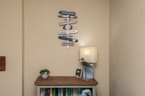 TV, comfortable sofas, coffee table, book case and lamp. Table and chairs that seats 6.