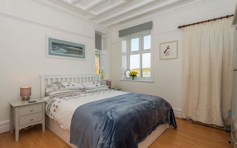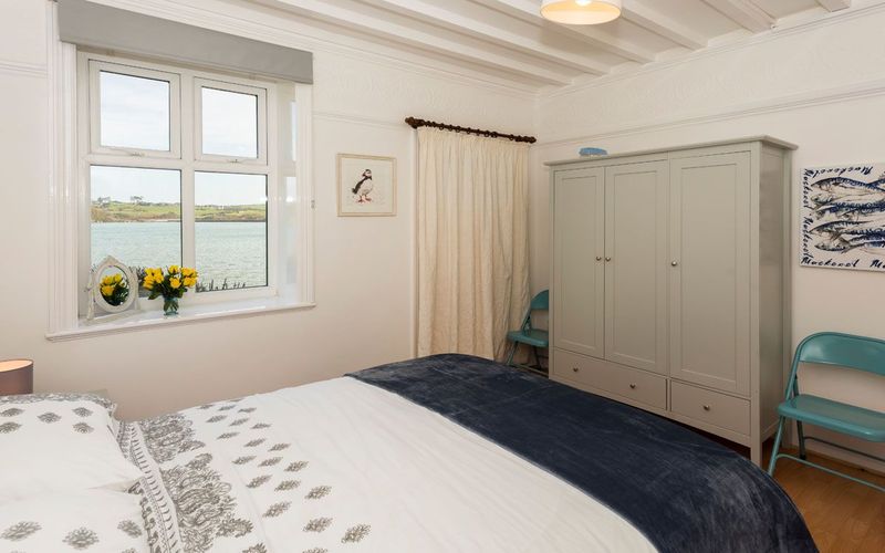 King-sized bed with an “Eve” mattress and sea views across the bay. The white beamed ceiling brings plenty of character to this double bedroom which also contains matching bedside cabinets and a triple wardrobe with shelves for plenty of storage. The small en suite contains a shower, heated towel rail and toilet.