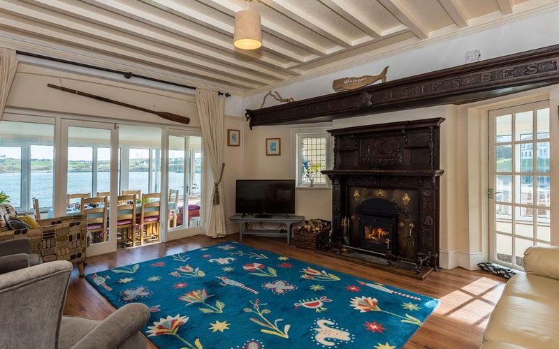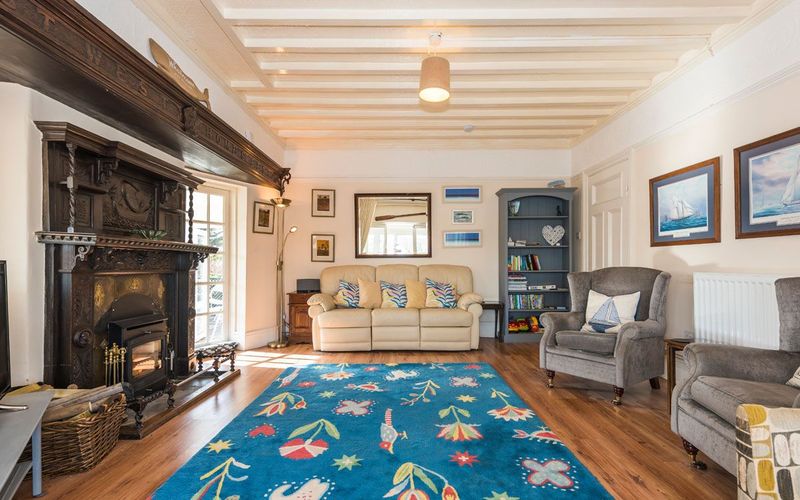 The light and airy well-proportioned lounge has the original ornate wooden fire surround with an integrated log burner, perfect to provide a welcoming glow and warmth on a winter evening. The white beamed ceiling and glass panelled doors give a feeling of lightness and airiness enhanced by the spectacular views out to sea. There is a 3-seater sofa, three armchairs, a 43 inch TV with Freeview and DVD player and a Bluetooth speaker. Books, games and DVDs are to be found on the shelves of the dresser.