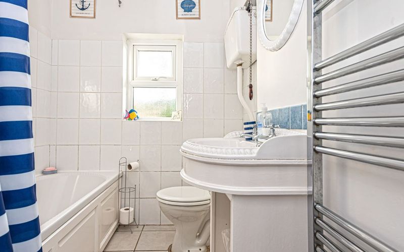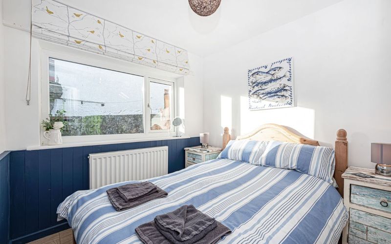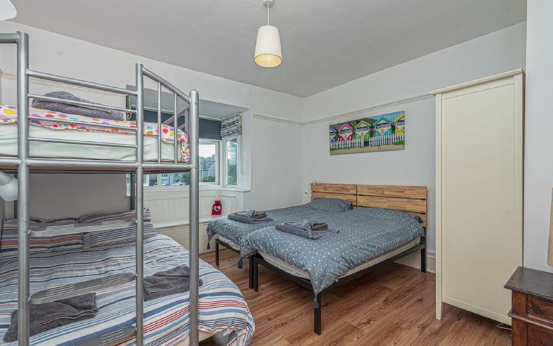 This bedroom contains twin single beds and a triple bunk (double bed on the lower bunk). There is also a wardrobe with draws, 2 further draws under the beautiful window seat with views onto the beach.