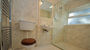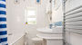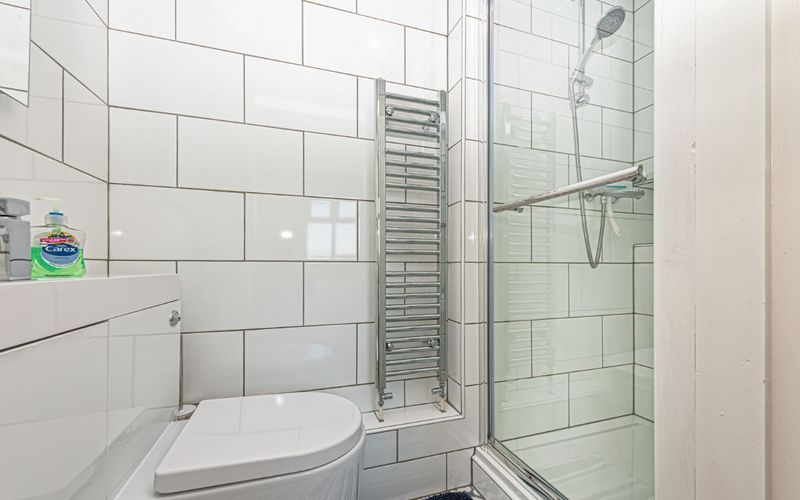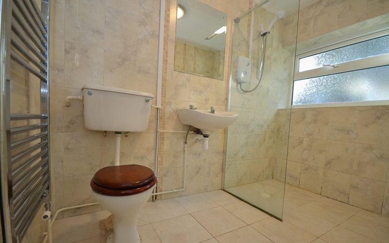 Next door to the bathroom is a spacious shower room with a walk-in shower, toilet, sink, electric fan heater and a heated towel rail.