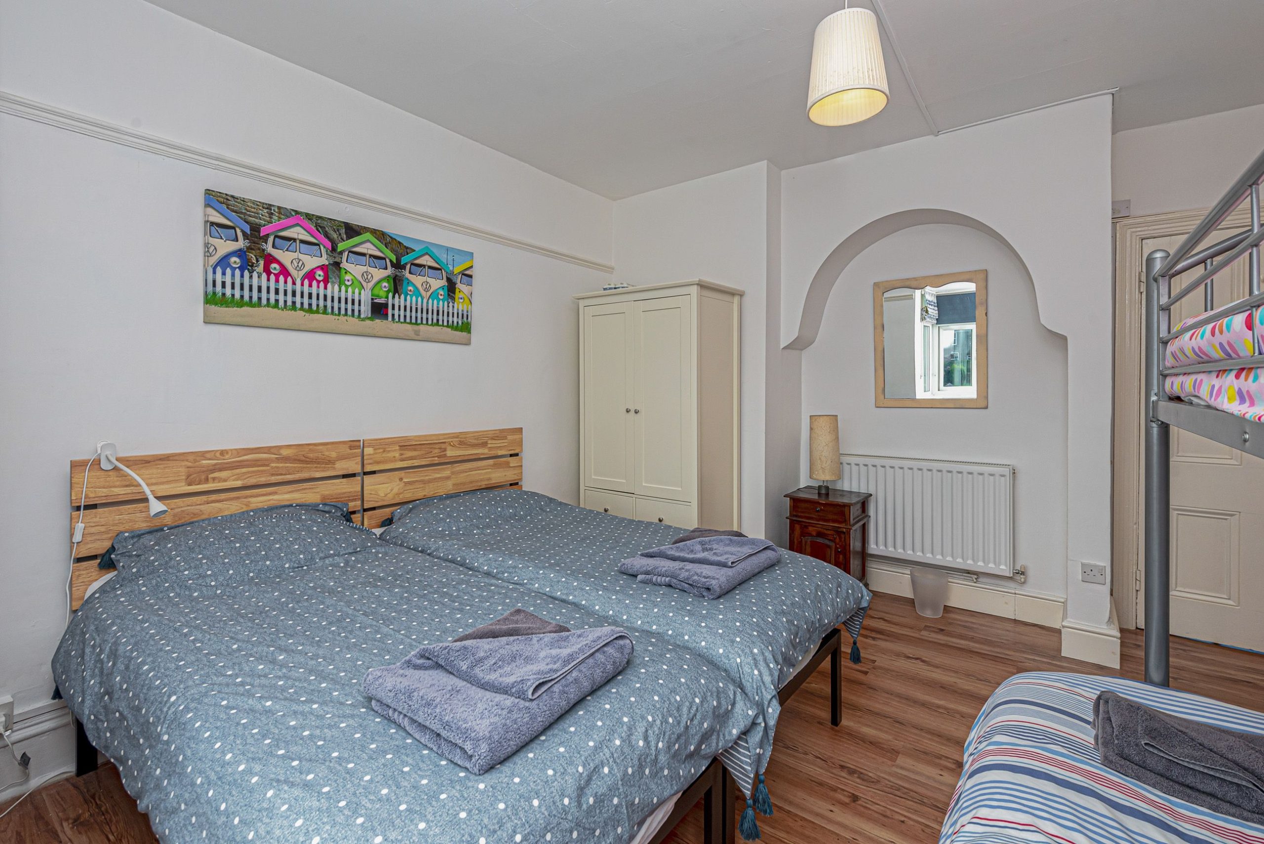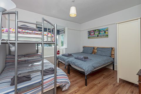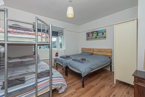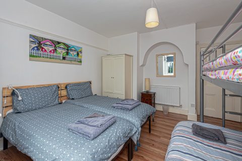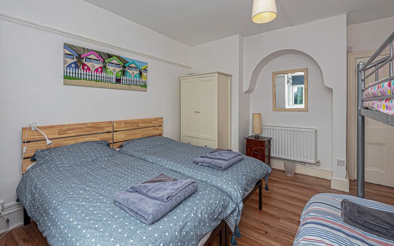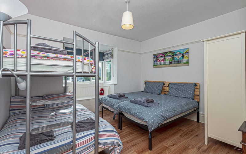 Second bedroom with twin single beds and triple bunk (double below, single above)