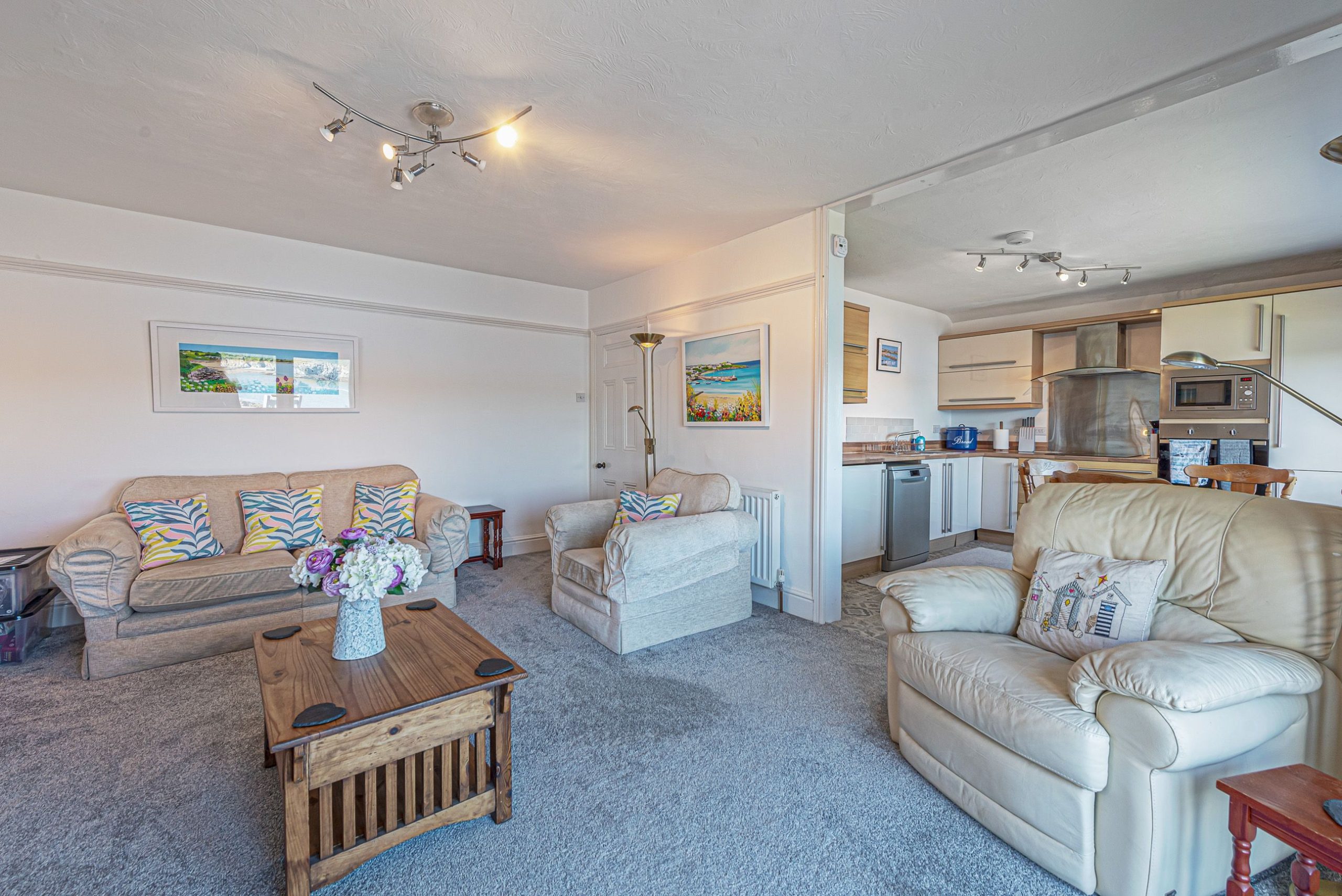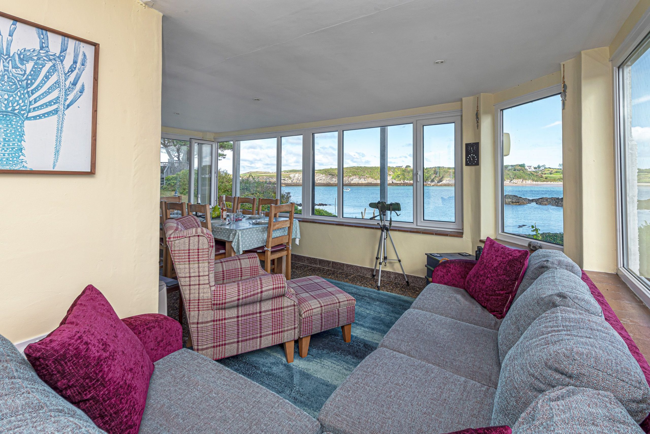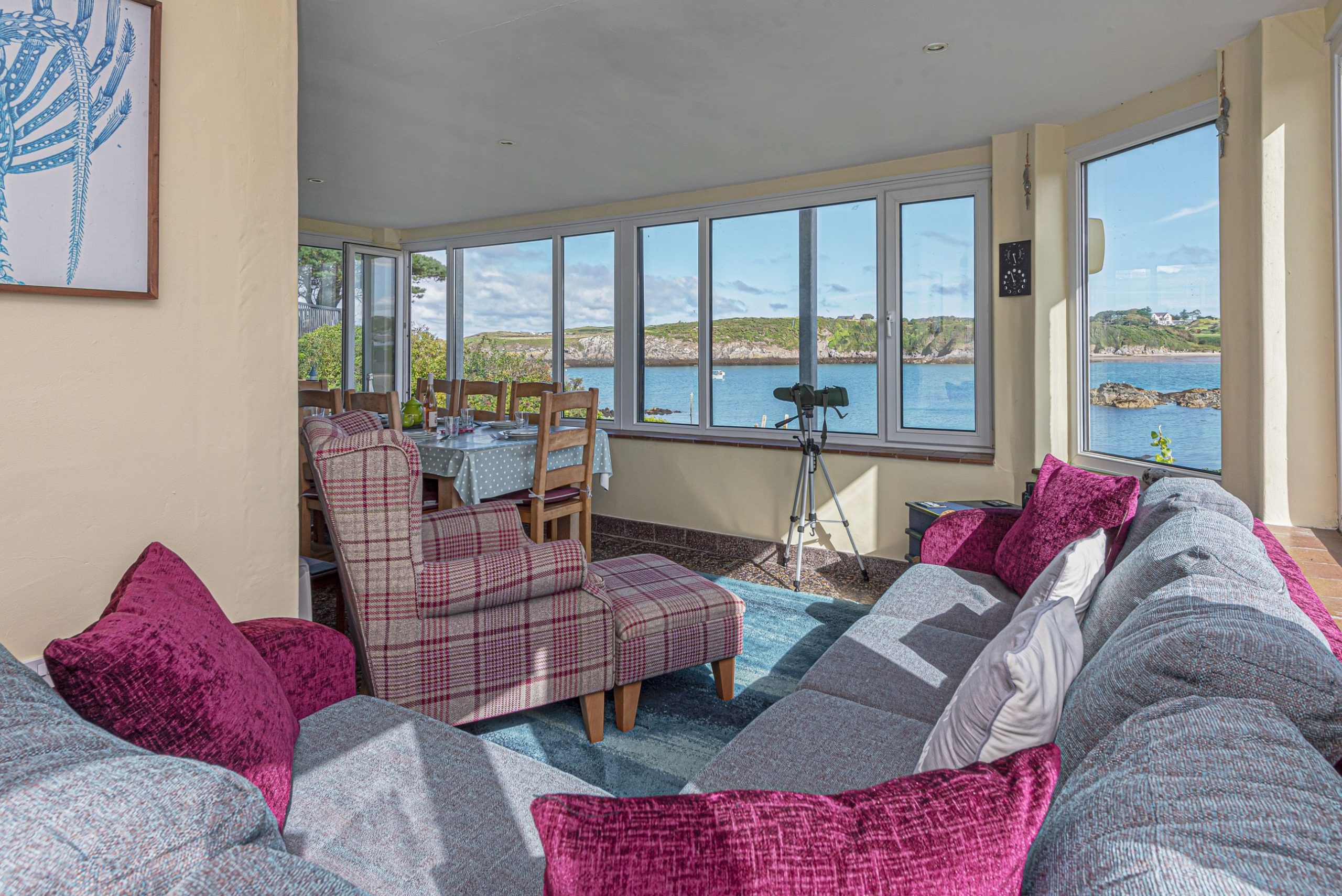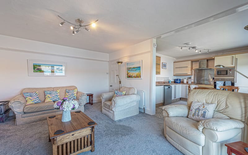 Open-plan lounge/kitchen with panoramic sea views