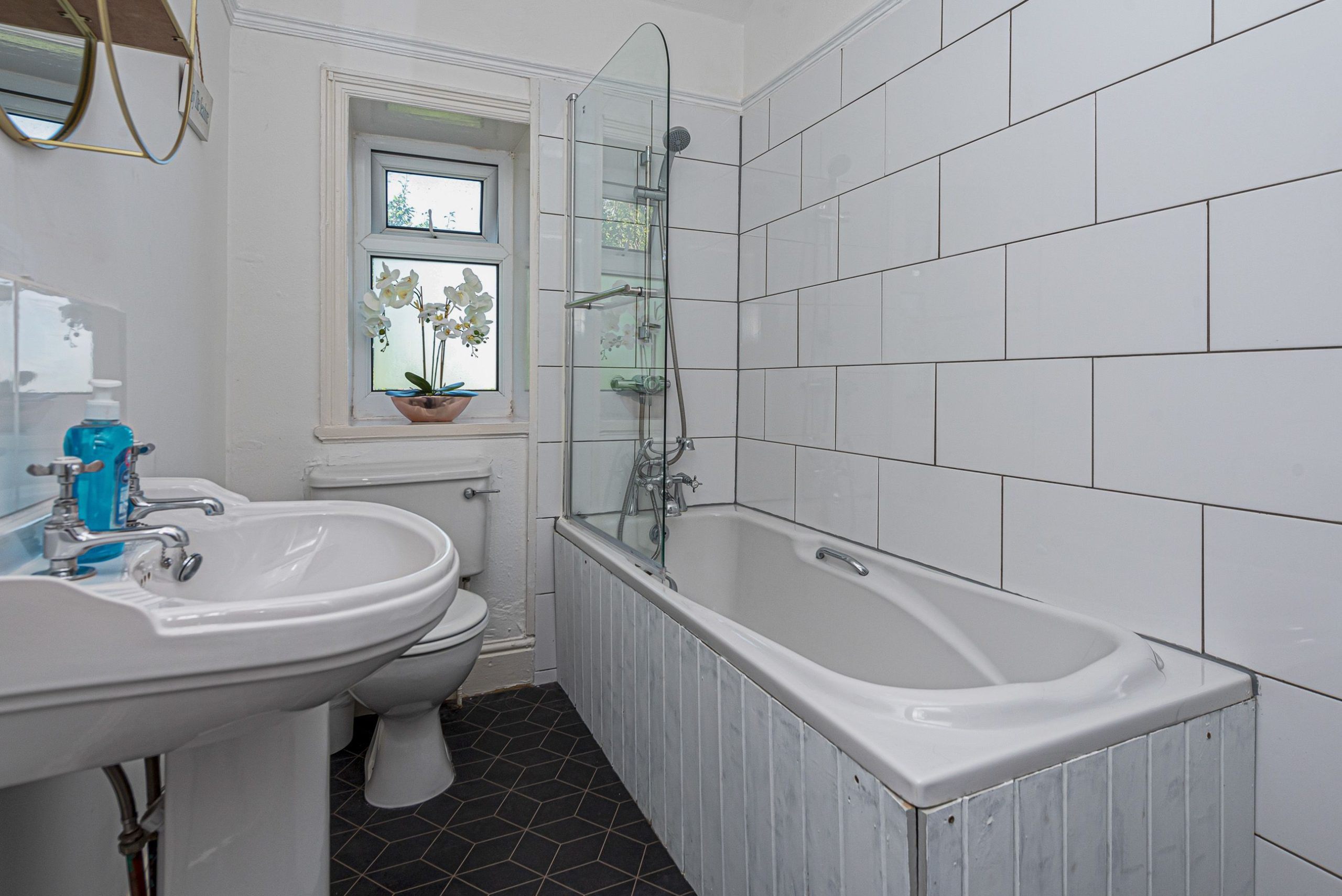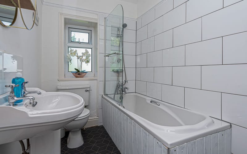 Family bathroom with full-size bath and overhead shower