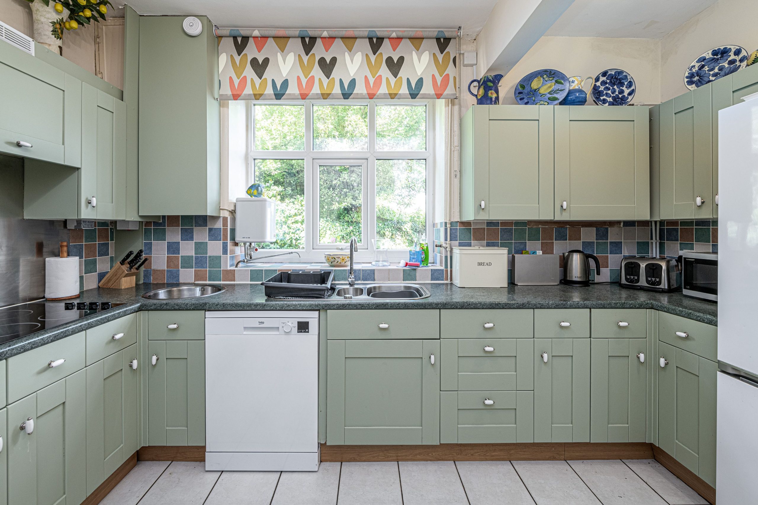 Fully equipped kitchen with dishwasher, fridge, freezer, microwave, and washing machine