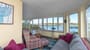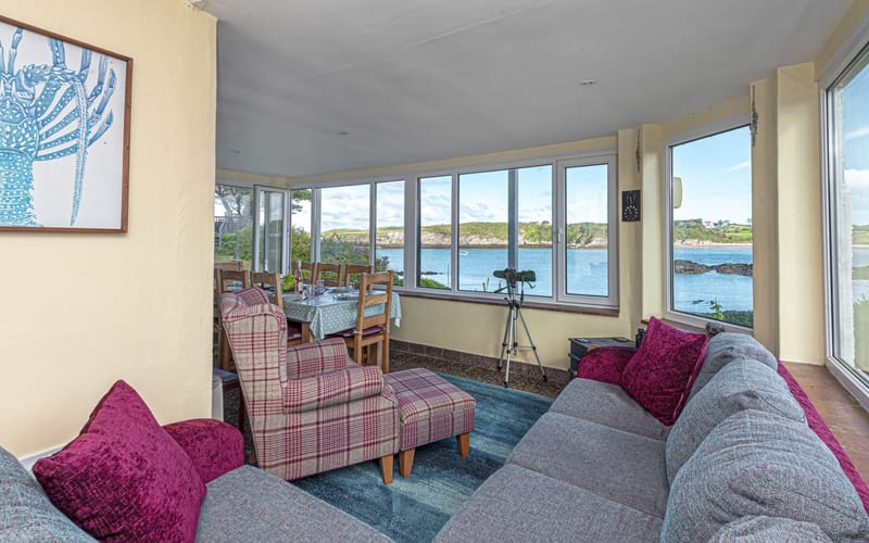 Wrap-around sunroom with dining table and seating area overlooking the bay