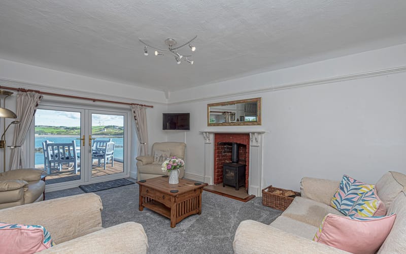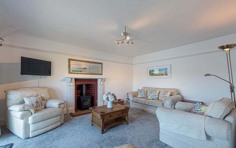 Spacious lounge with comfortable seating, TV, DVD player, and log-burning stove