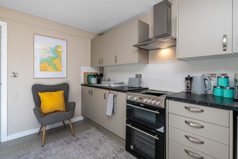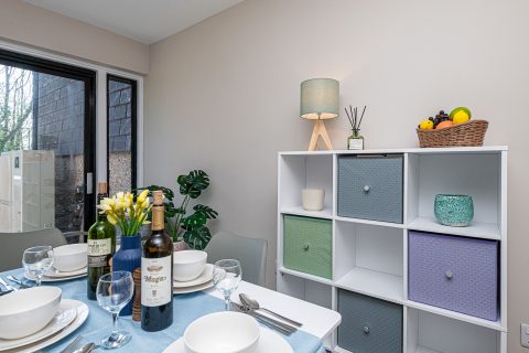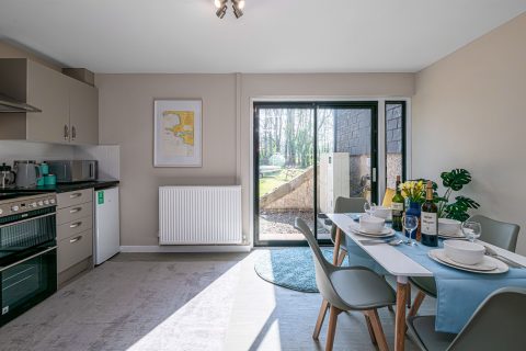 Small but well equipped kitchen located on the ground floor with an under counter fridge freezer, cooker and microwave. Plus a dining area for 8 with patio doors opening onto a small patio and shared garden with picnic tables