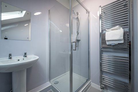 First floor bathroom with shower, toilet and sink.