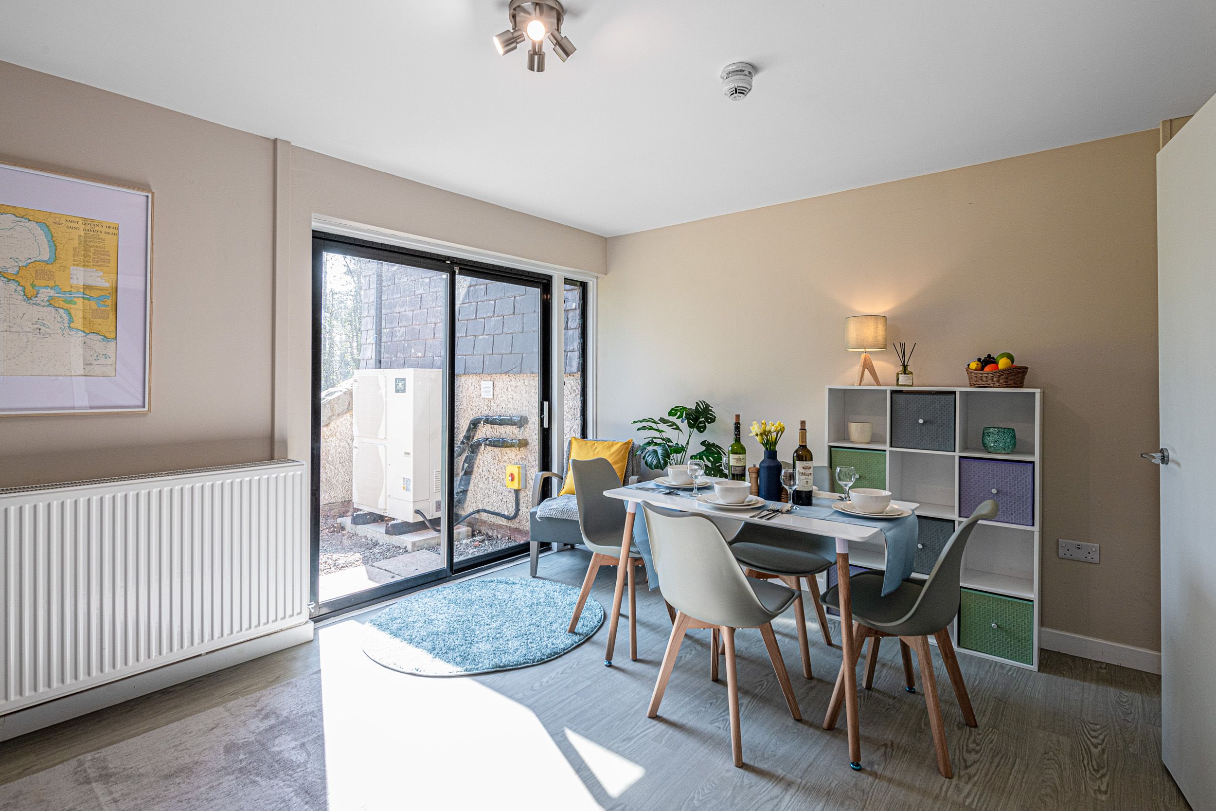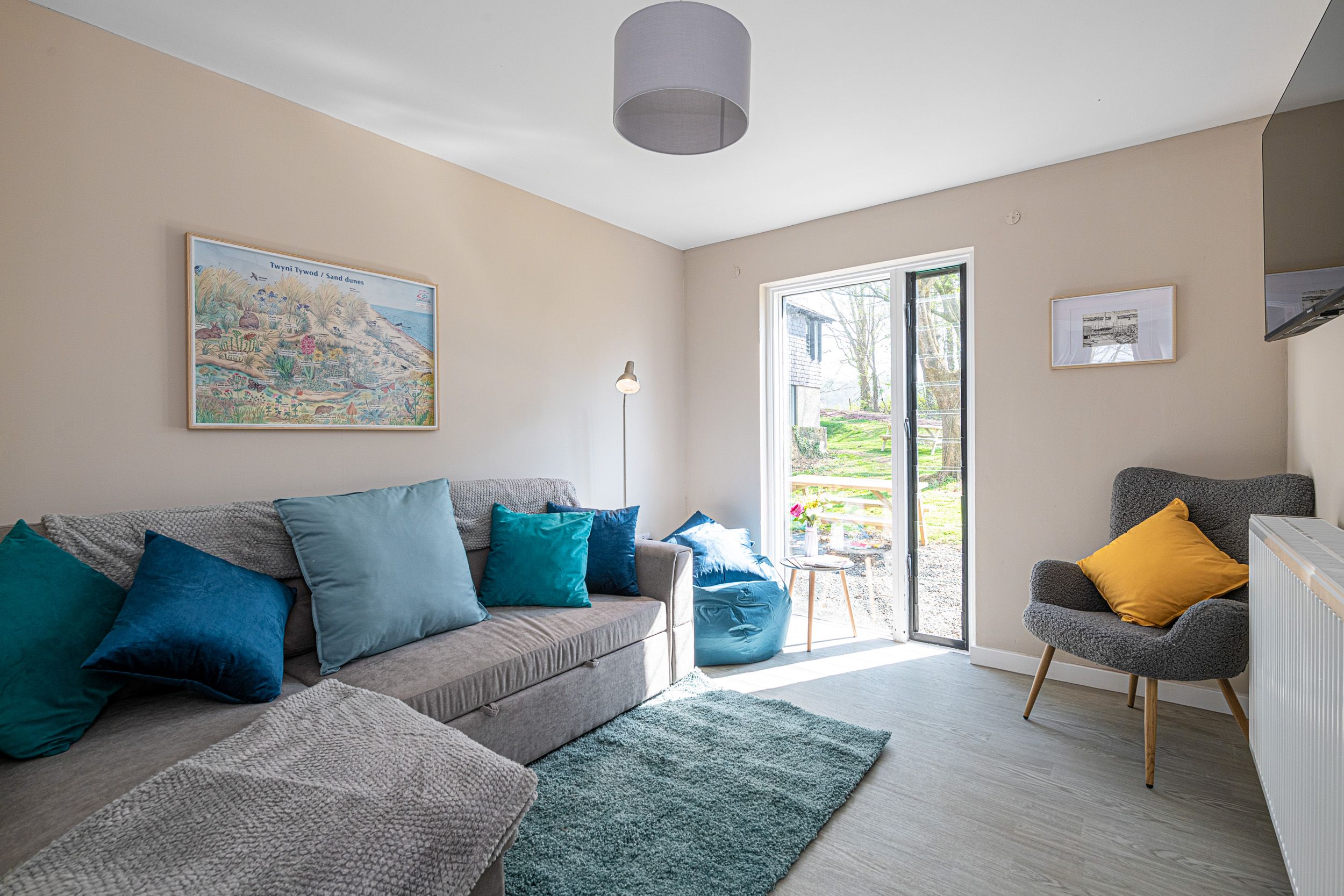 Small patio area with shared garden and picnic tables. Access to the grounds of Plas Menai along with cycle pump track, outdoor spaces and mountain bike trac