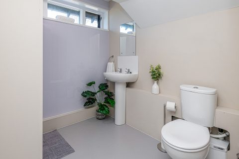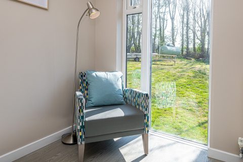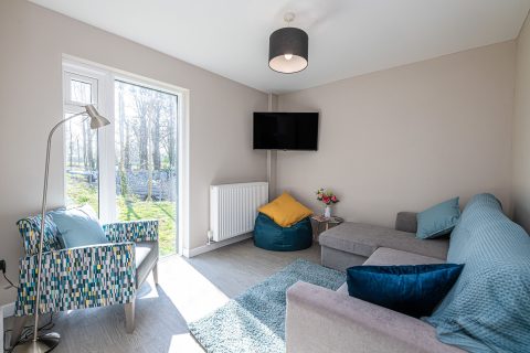 Small patio area with shared garden and picnic tables. Access to the grounds of Plas Menai along with cycle pump track, outdoor spaces and mountain bike track.