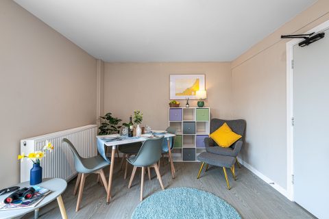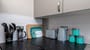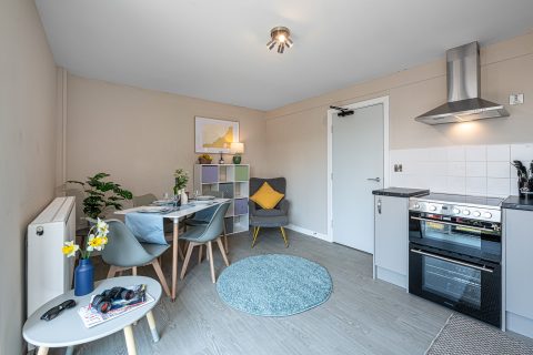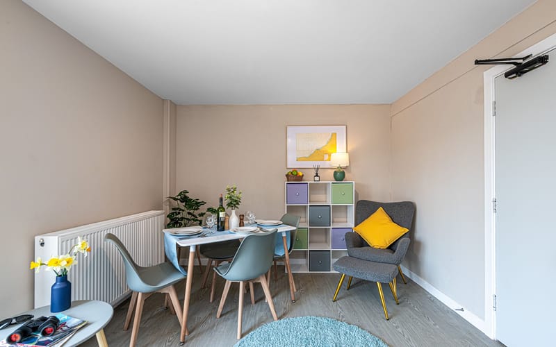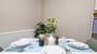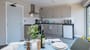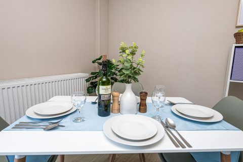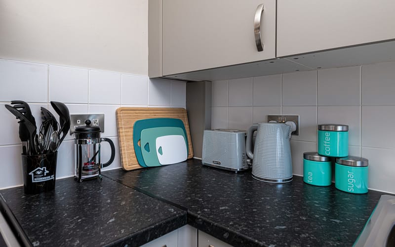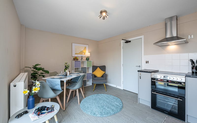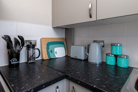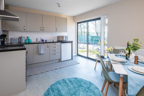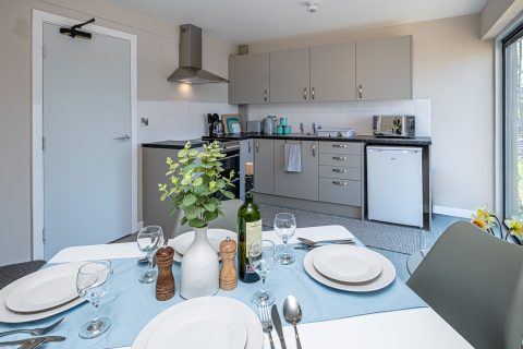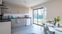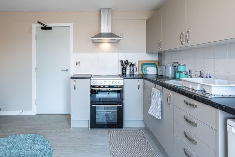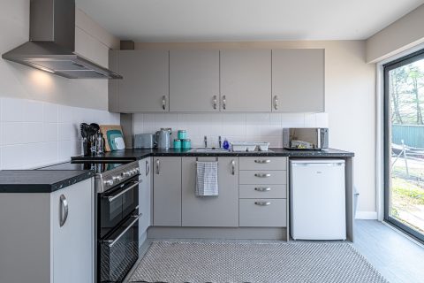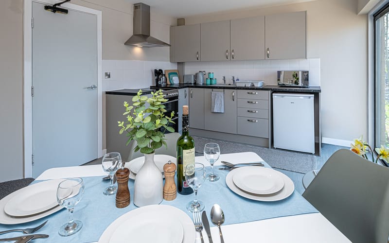 Small but well equipped kitchen located on the ground floor with an under counter fridge freezer, cooker and microwave. Plus a dining area for 8 with patio doors opening onto a small patio and shared garden with picnic tables