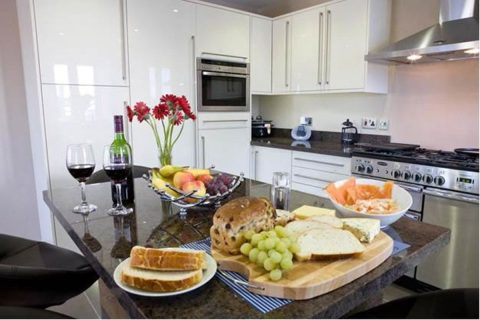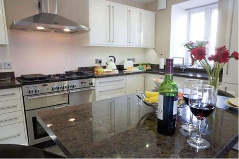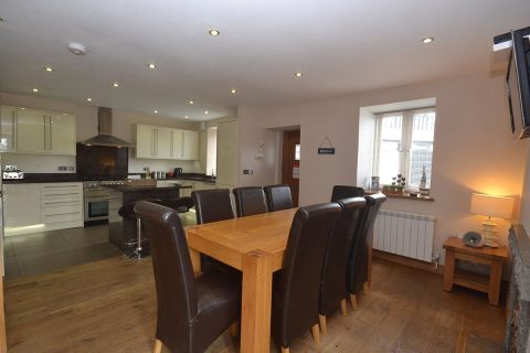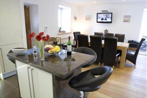 The fully fitted kitchen with its granite worktops forms the hub of the Cemaes Bay accommodation, including a large breakfast island. The spacious kitchen contains a ‘Range Master’ cooker with five gas hobs, a large fridge with 6 shelves, a freezer (4 drawers), dishwasher, microwave and a toaster.