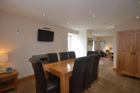 An archway leads through to the airy sitting room of this Cemaes Bay cottage, with sea view and doors onto the harbour-side terrace. There is a 32 in LCD TV with a free view box also in the dining area.