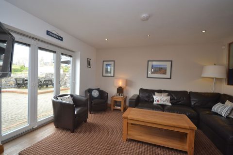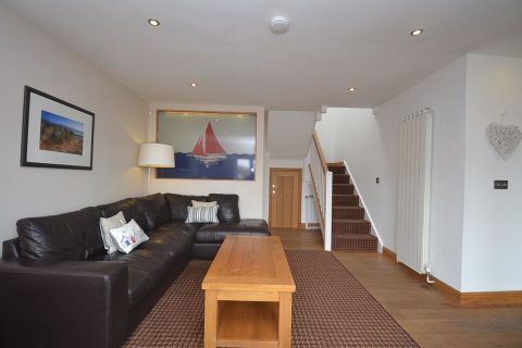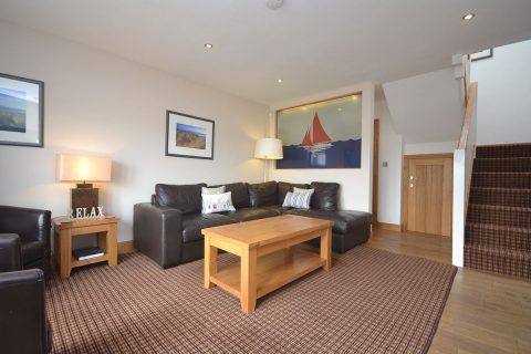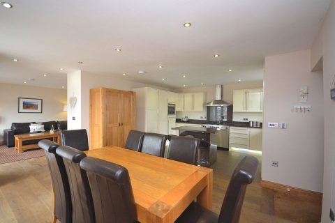 The lounge has a comfortable ‘L’ shaped leather sofa and two leather chairs. There is a large pine coffee table and a small pine side table that complement the natural pine flooring. The patio doors offers fine views of the beach and sea. There is a 48in TV, Free View box and a DVD player with plenty of DVDs stored on the shelves below. This impressive room is a great place to relax and enjoy the sea views and magical evening sunsets.