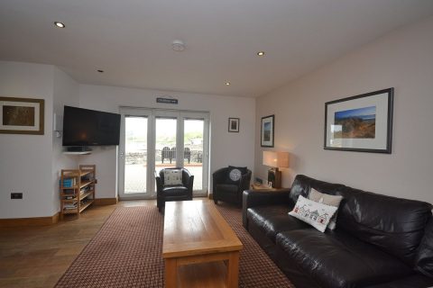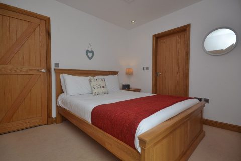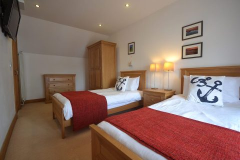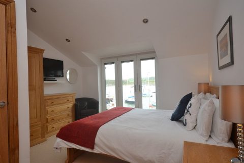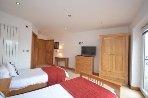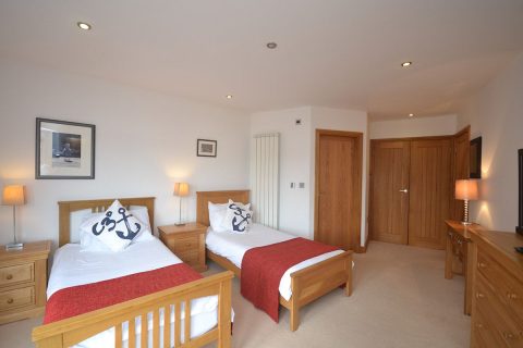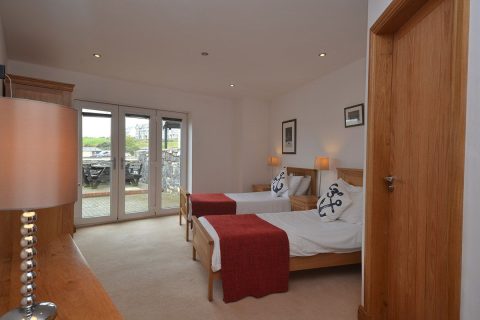 This ground floor bedroom enjoys lovely views over the bay and contains two single beds, two bedside cabinets, a large wardrobe and a chest of drawers set. This bedroom also has a 32in TV with Free View box and the patio doors open onto the harbour side terrace.