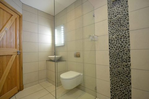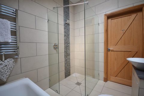 This stylish bathroom contains a spacious walk-in shower, toilet, hand washbasin and a heated towel rail.