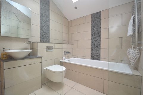 The en-suite bathroom contains a bath, toilet, hand washbasin and a heated towel rail.