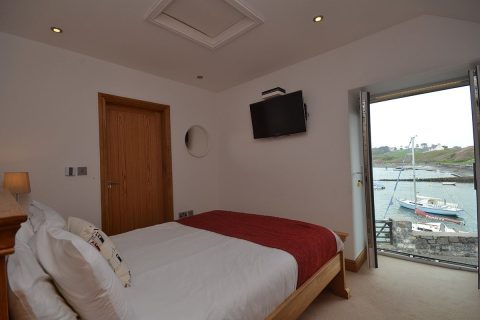 This spacious bedroom contains a King size bed, chest of drawers set, large wardrobe, two bedside cabinets and a 32in TV with Free View box and DVD player. The Juliet balcony offers great views over the Cemaes Bay.