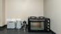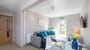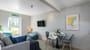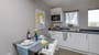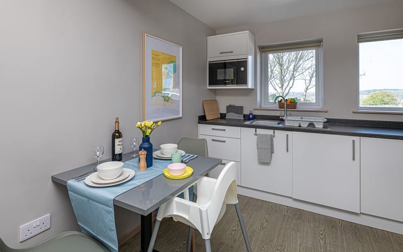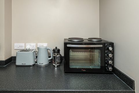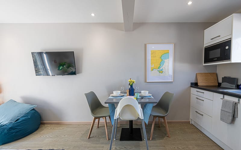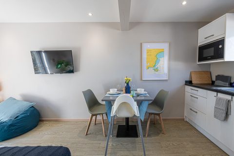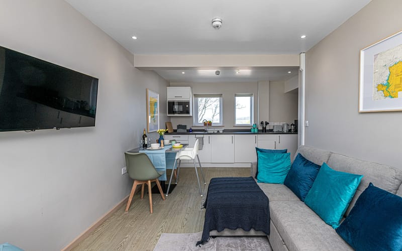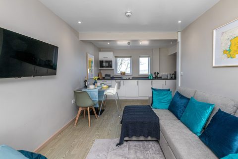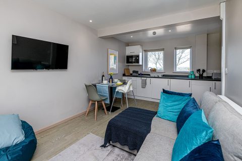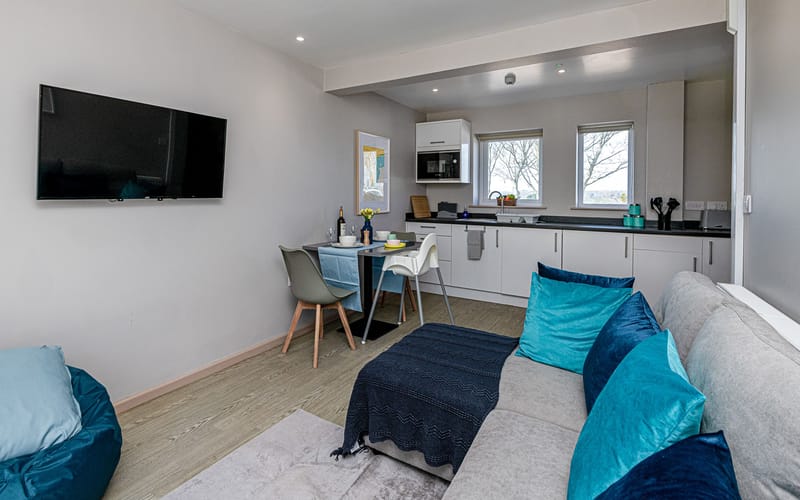Small but well equipped kitchen located on the ground floor with an under counter fridge freezer, counter top cooker, washing machine and microwave. Ground floor with patio doors onto a small outdoor area with picnic table. Sofa bed and Smart TV along with dining table and chairs seating 6