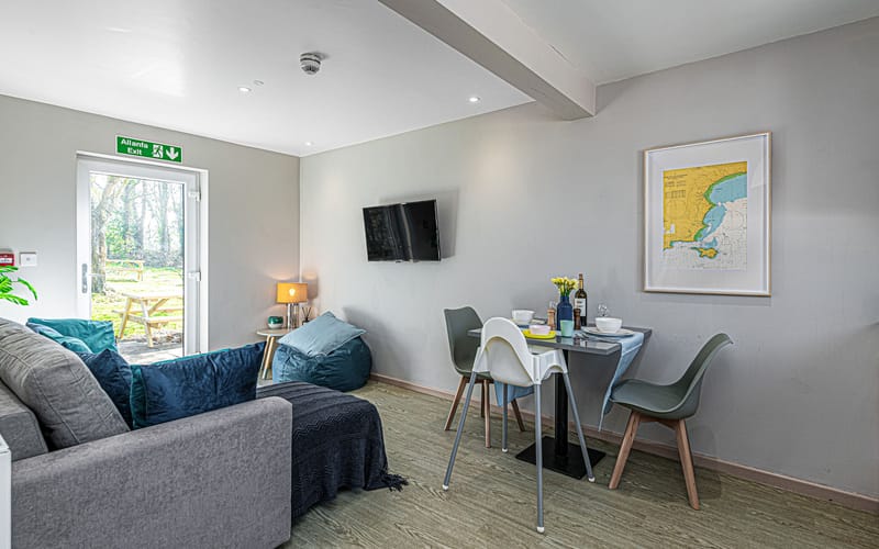 Small patio area with picnic table. Access to the grounds of Plas Menai along with cycle pump track, outdoor spaces and mountain bike track.